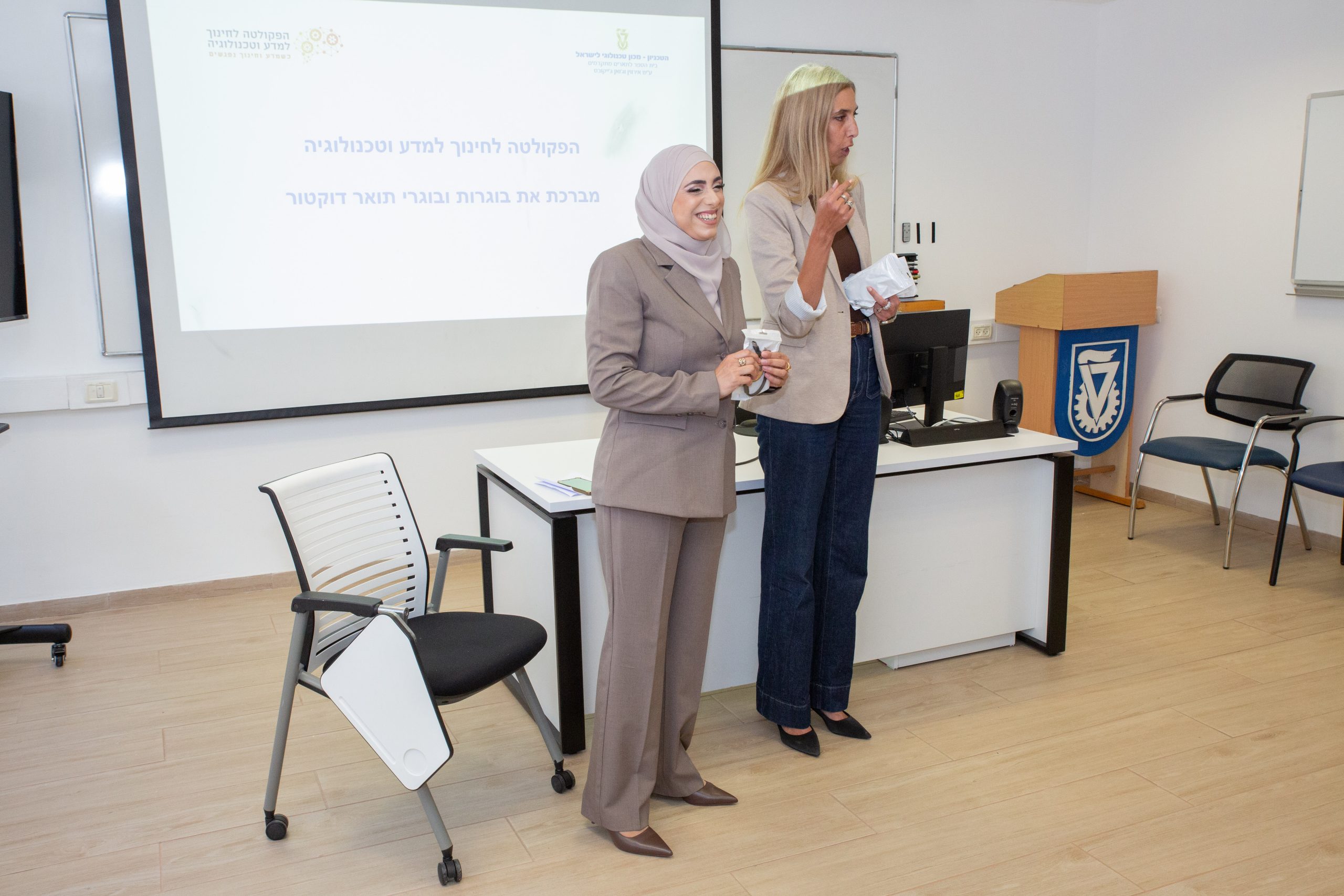 יום מחקר פקולטי 26 בנובמבר 2019, הצגת פוסטרים. הזוכות: מקום ראשון: מסטרנטית חלימה שרקייה, בהנחיית ד”ר זהבית כהן, שמונחה שלה זכה זו השנה השנייה ברציפות. מקום שני: דוקטורנטית טל יכין, בהנחיית פרופ”ח מירי ברק, שהגישה את הרצאת הבזק בחרוזים, לשמחת הקהל. מקום שלישי: מסטרנטית שחף רוקר יואל, בהנחיית הדיקנית, פרופ’ יהודית דורי, שגובתה בצוות מנבחרת הרובוטיקה של בית הספר הריאלי, והרובוט genesis