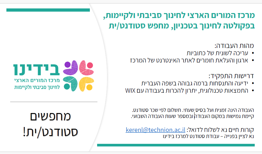 תקופת העבודה: החל מחודש אוקטובר 2025, ולאחר מכן במשך שנת הלימודים תשפ"ו (למעט חופשות טכניוניות)